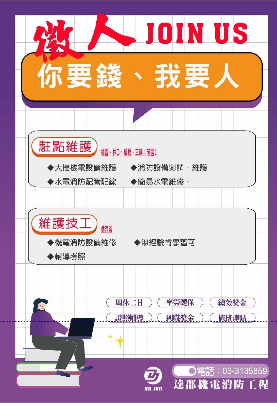 徵人 大樓駐點助理工程師 大樓機電消防設備維護 簡易水電維修 ......
